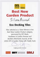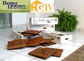 | Eco Decks™ ECO Decks is a high quality award winning deck tile flooring system. Our deck tile products are designed to cover any exterior hard surface, quickly and easily transforming it into a durable fast fit outdoor floor. there is only one Eco Decking Tile and it is only available through us. There are many imitations that have sprung up on the market since we introduced this product in 2005, but none compare to the original. The unique modular tiles could not be easier to use- each one is backed with a weatherproof polypropylene base that simply clicks together, in fact a whole floor can be laid by one person in just a few minutes or an hour or so (depending on size). Call us for pricing and order information at 1 866 326 4418 More uses than conventional decking Ideal for patios, walkways, decking resurfacing; hot tub surrounds; porch and entrance ways, etc. The Tiles can easily be cut to shape and can even be used in situations where conventional decking would not be suitable such as balconies and roof gardens. |